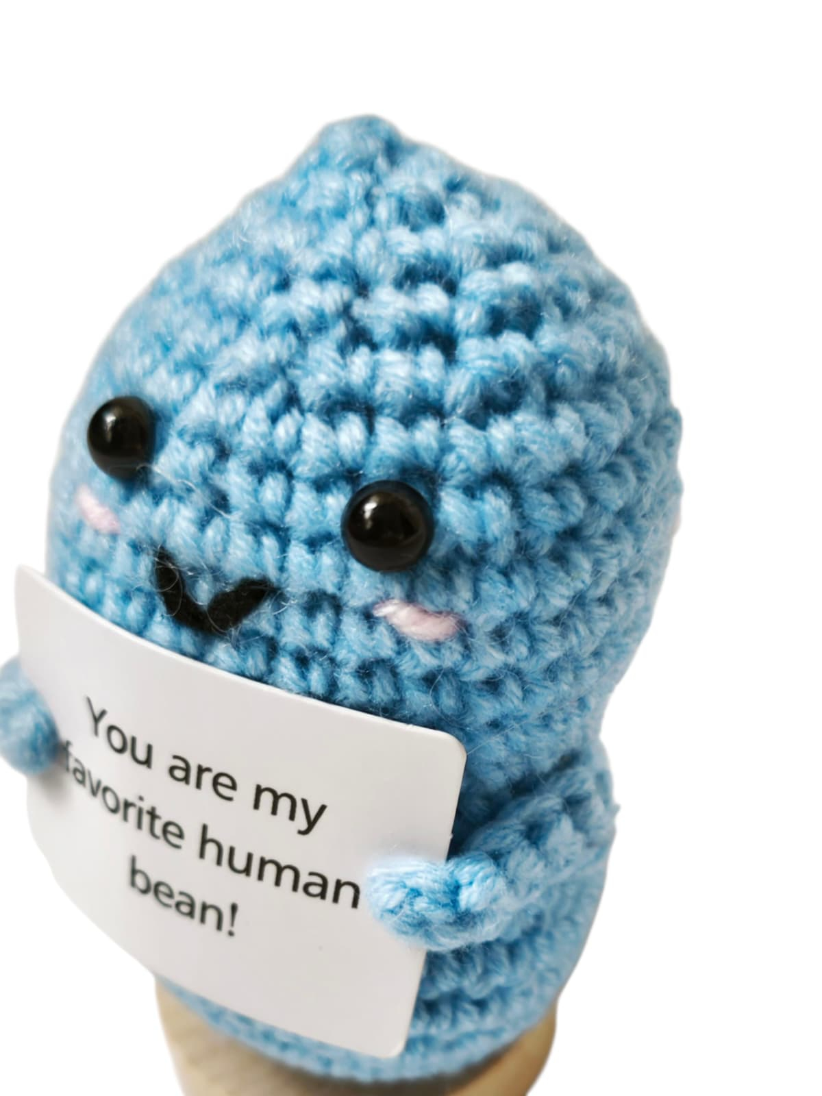 Figurina crosetata amuzanta cu mesaj pozitiv — un mic decor perfect pentru birou, casa sau cadou. Realizata manual din fire moi, fiecare figurina transmite un mesaj motivational haios care aduce zambete si buna dispozitie. Ideala pentru a inveseli ziua cuiva sau pentru a adauga un strop de umor si inspiratie in decorul tau.