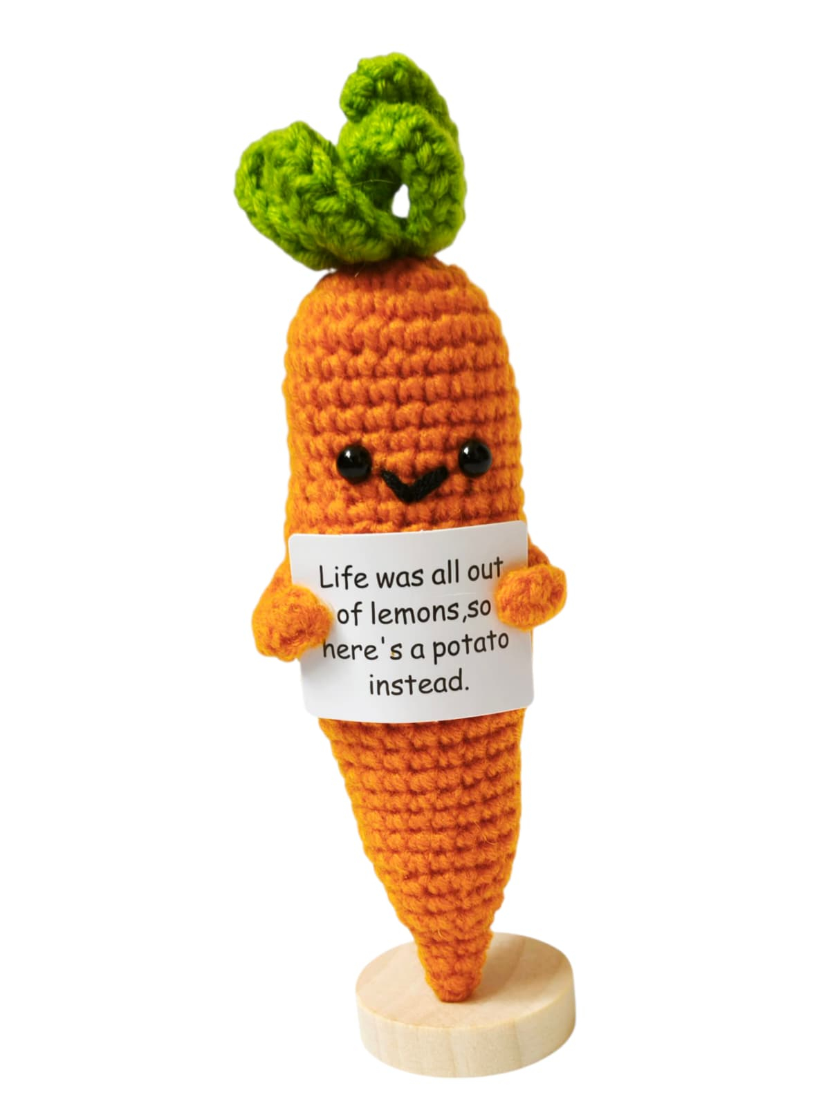 Figurina crosetata amuzanta cu mesaj pozitiv — un mic decor perfect pentru birou, casa sau cadou. Realizata manual din fire moi, fiecare figurina transmite un mesaj motivational haios care aduce zambete si buna dispozitie. Ideala pentru a inveseli ziua cuiva sau pentru a adauga un strop de umor si inspiratie in decorul tau.