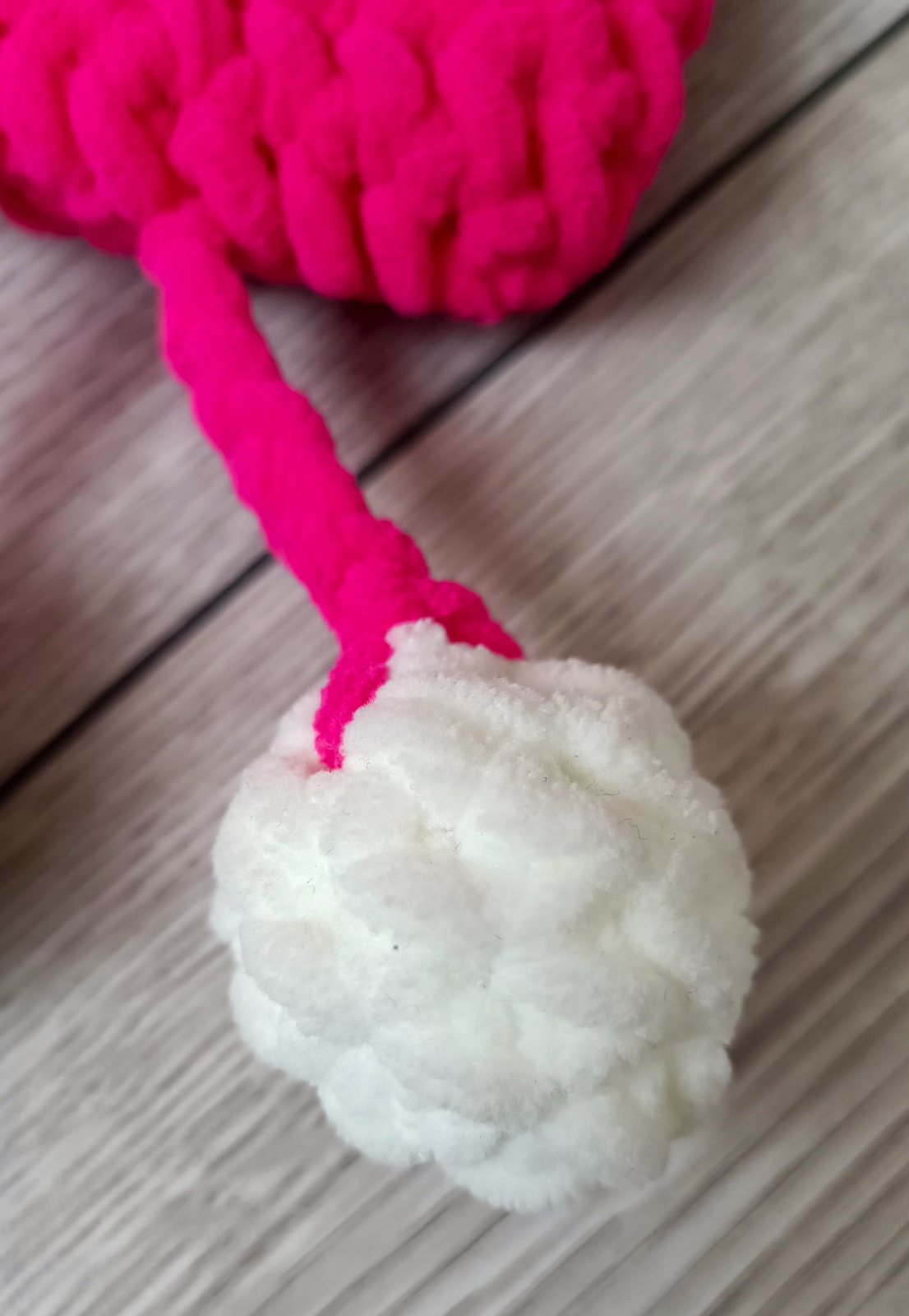 Design: Partea frontala este decorata cu doi ochi mari, rotunzi, realizati din fir alb crosetat, in mijlocul carora sunt cusute nasturi negri, conferindu-i un caracter jucaus si prietenos. Acesti ochi adauga un strop de personalitate si veselie, transformand geanta intr-un accesoriu distinctiv. De asemenea, aceasta are doua brate decorative, formate din snururi crosetate si terminate cu bile albe voluminoase.