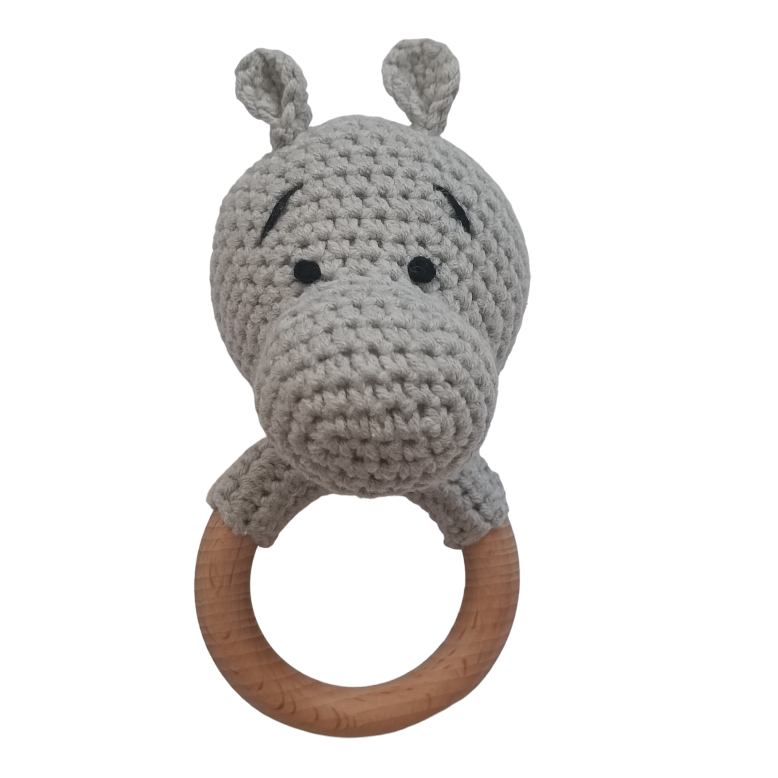 Jucarie dentitie din lemn non-toxic cu forma de hipopotam crosetat.