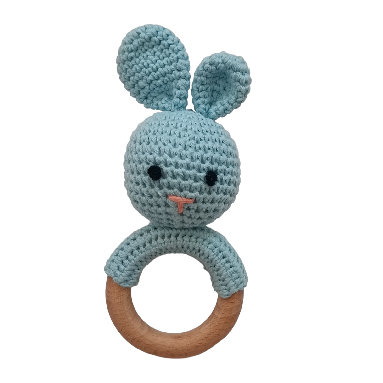 Jucarie dentitie din lemn non-toxic cu forma de iepure albastru crosetat.