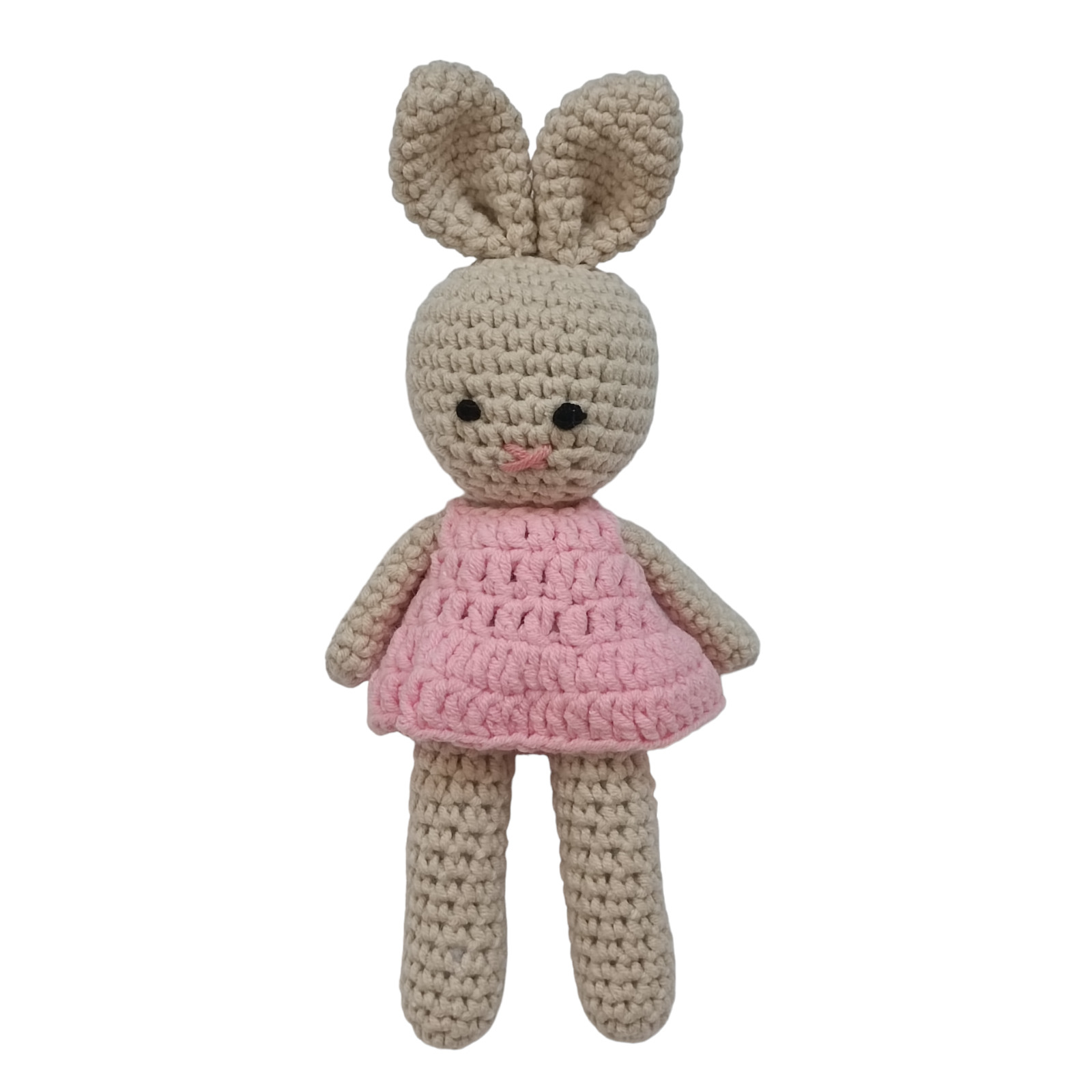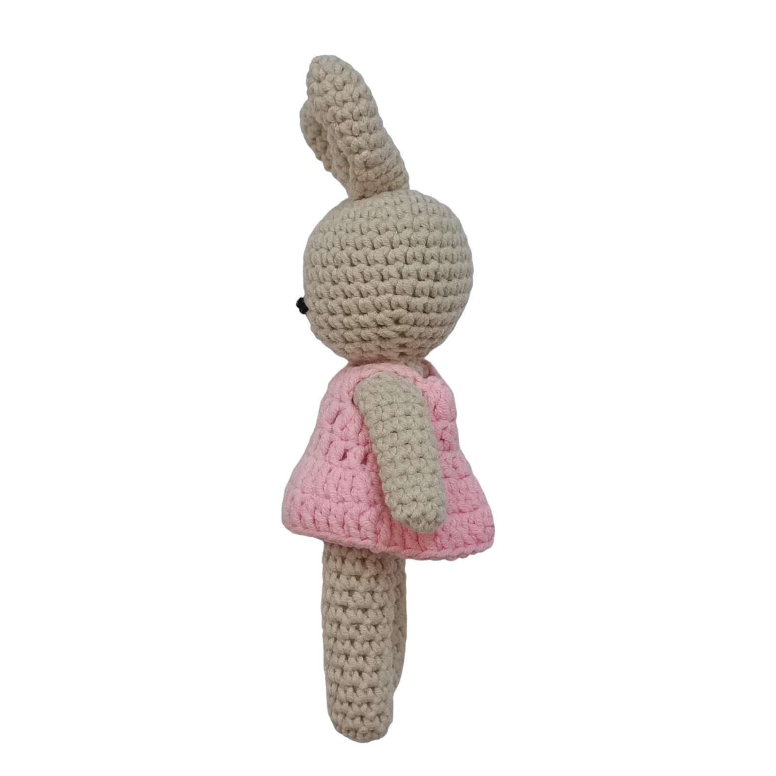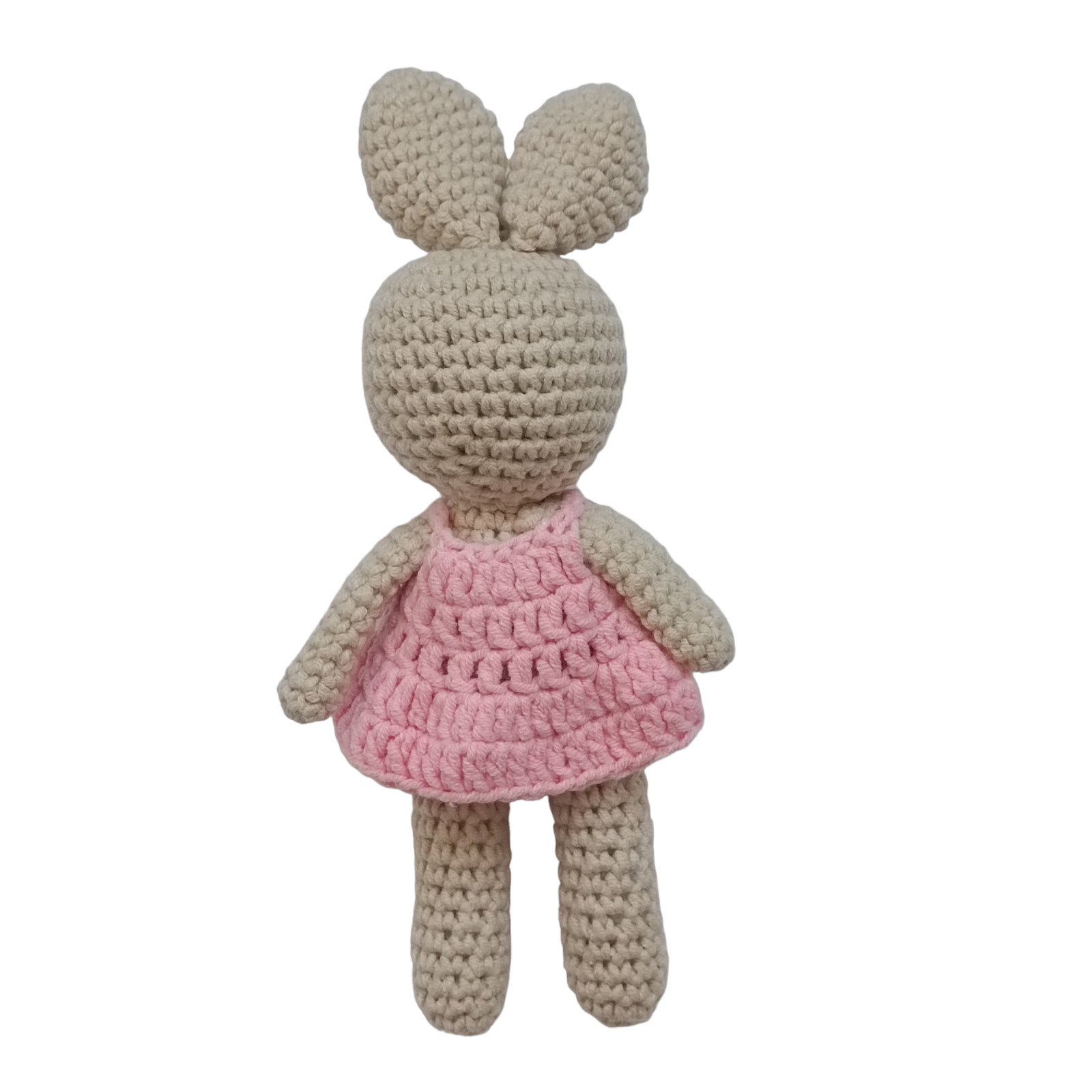 Iepure cu rochita roz crosetata, lucrata din fir de bumbac, rochita crosetata detasabila.