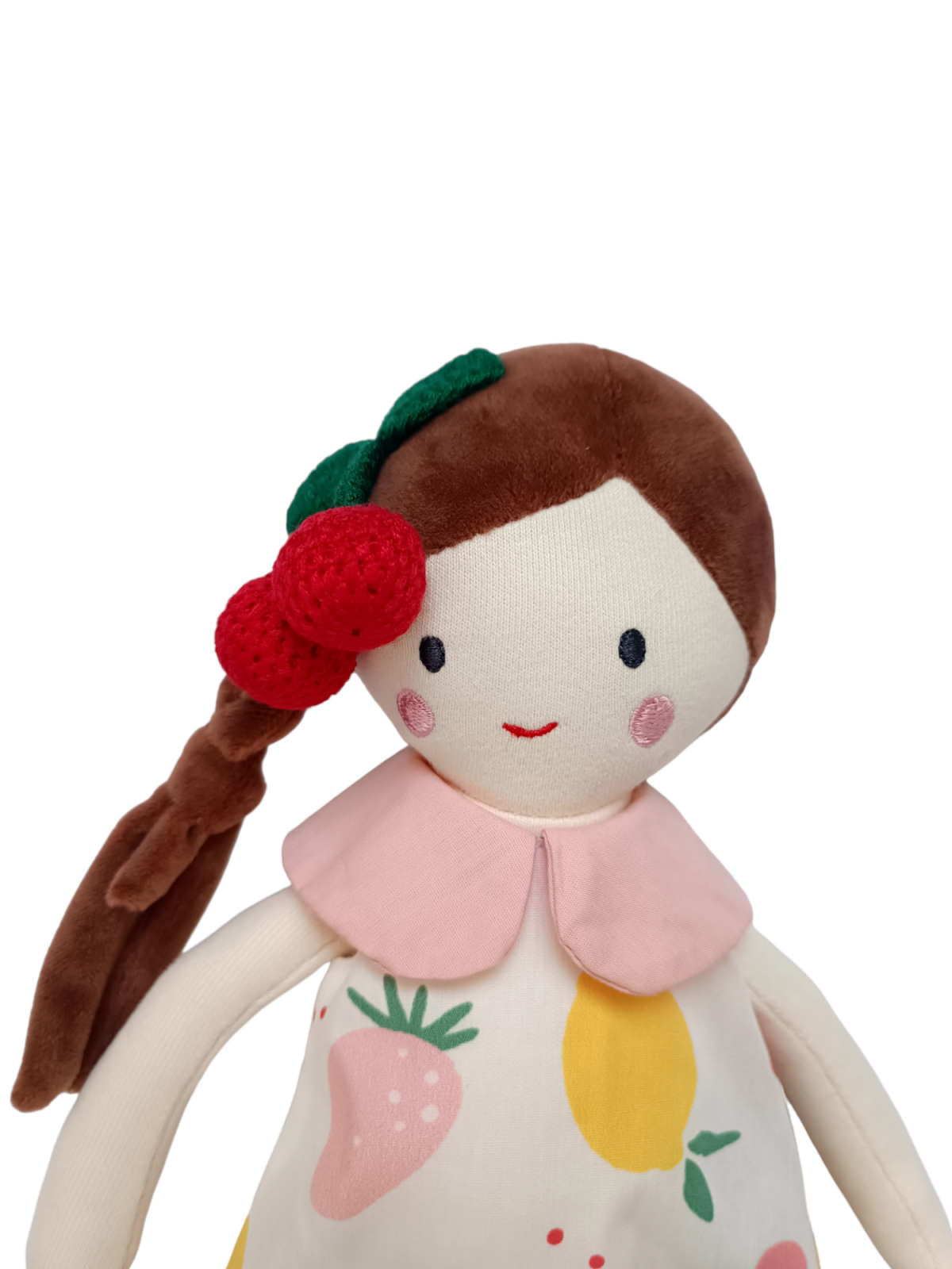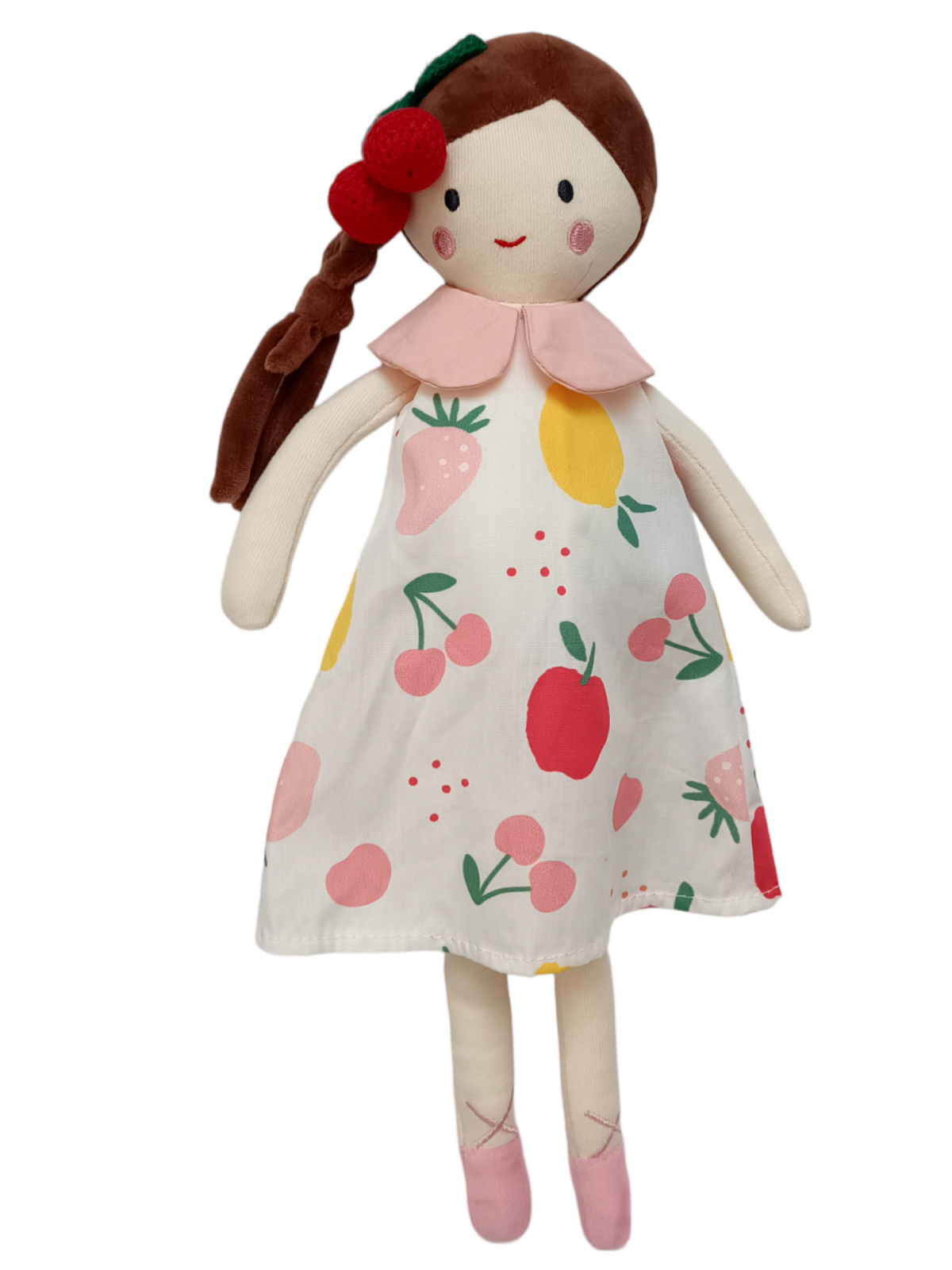 Aceasta papusa adorabila poarta o rochita cu tematica de fructe. Are parul castaniu, prins intr-o parte cu un accesoriu rosu care seamana cu o cireasa.