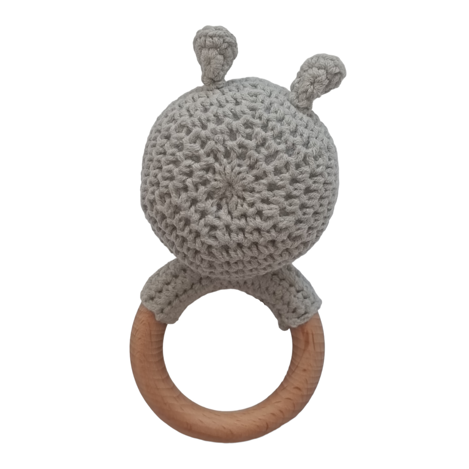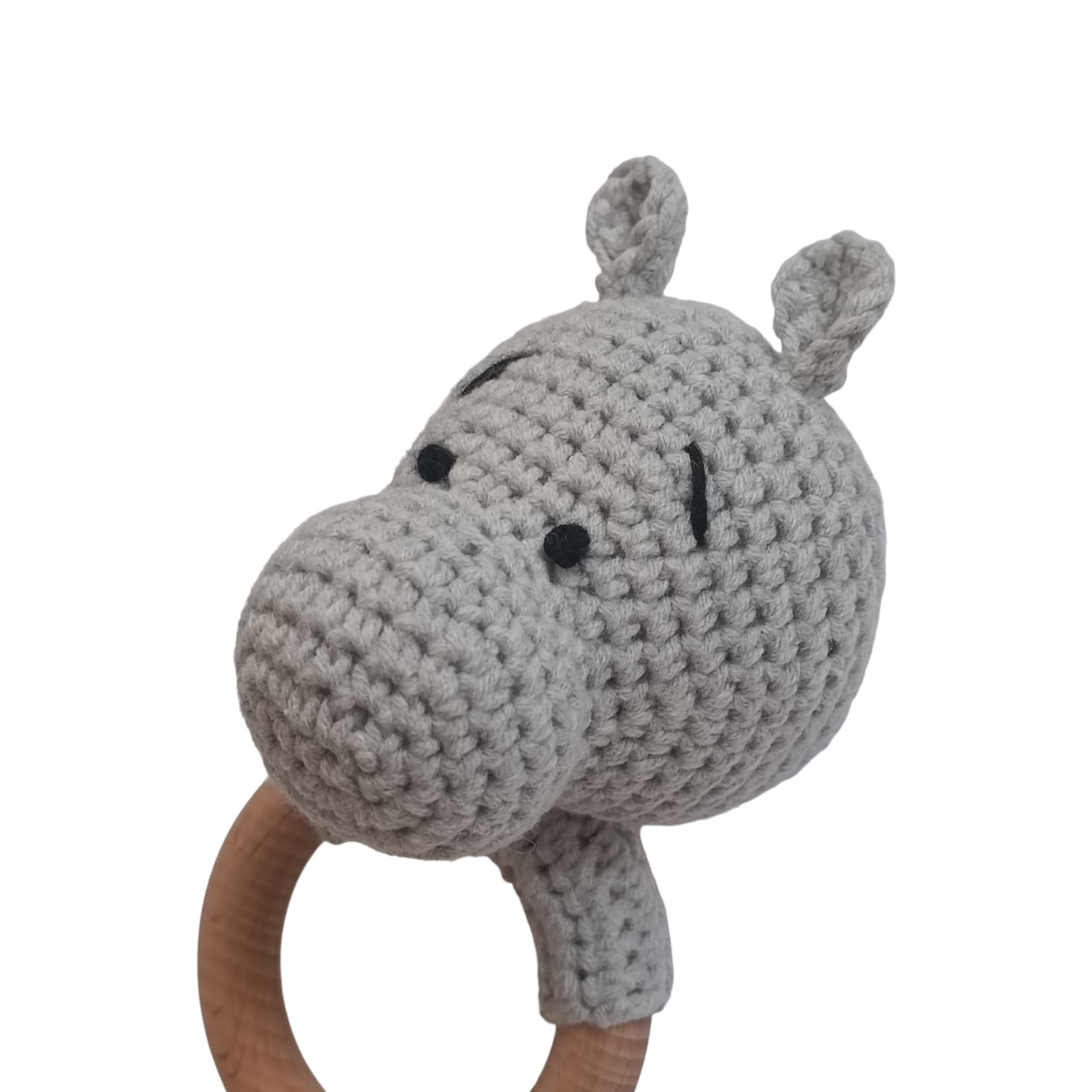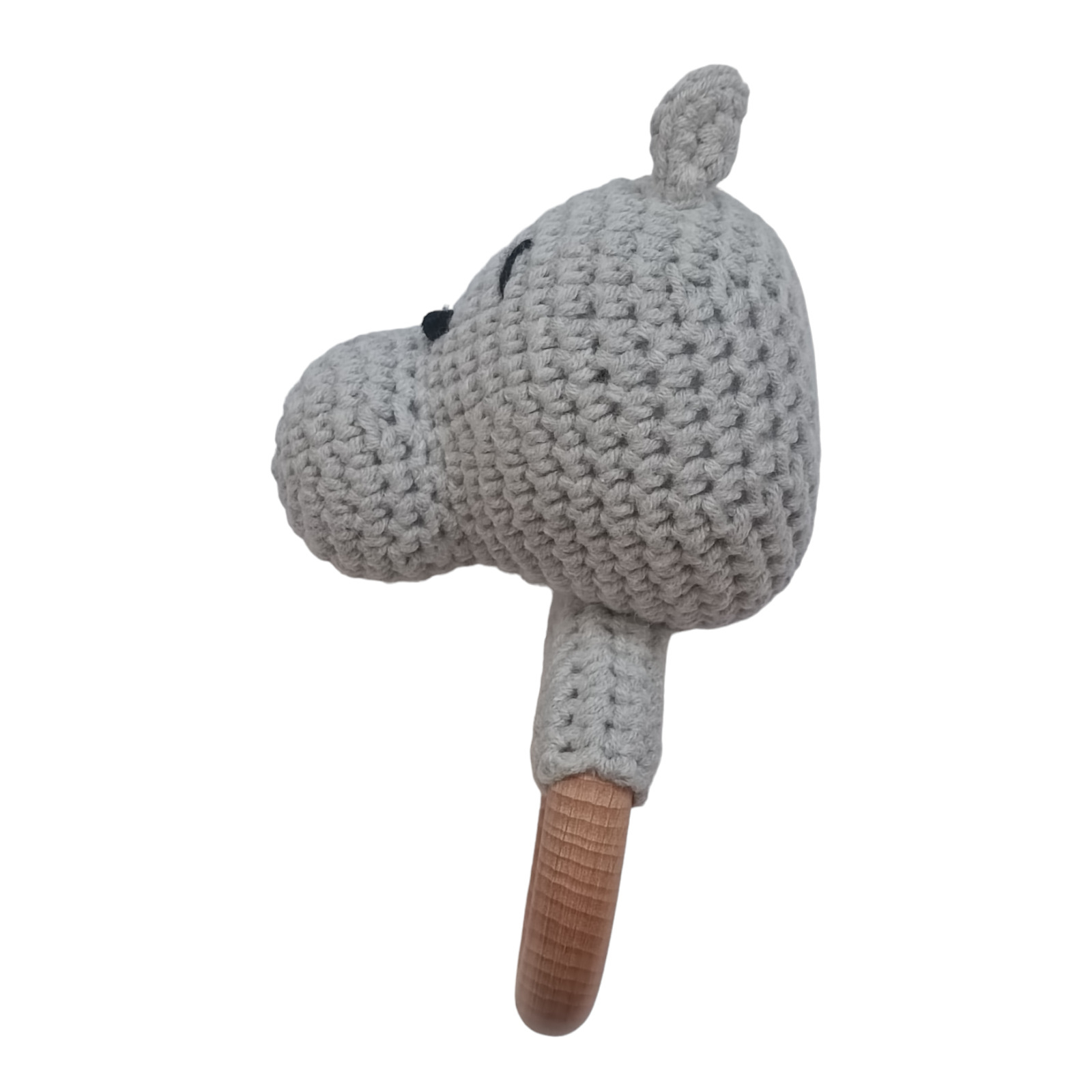 - Jucarie zornaitoare crosetata hipopotam de culoare gri – stimuleaza simturile si dexteritatea bebelusului. Dimensiune produs: 18 cm