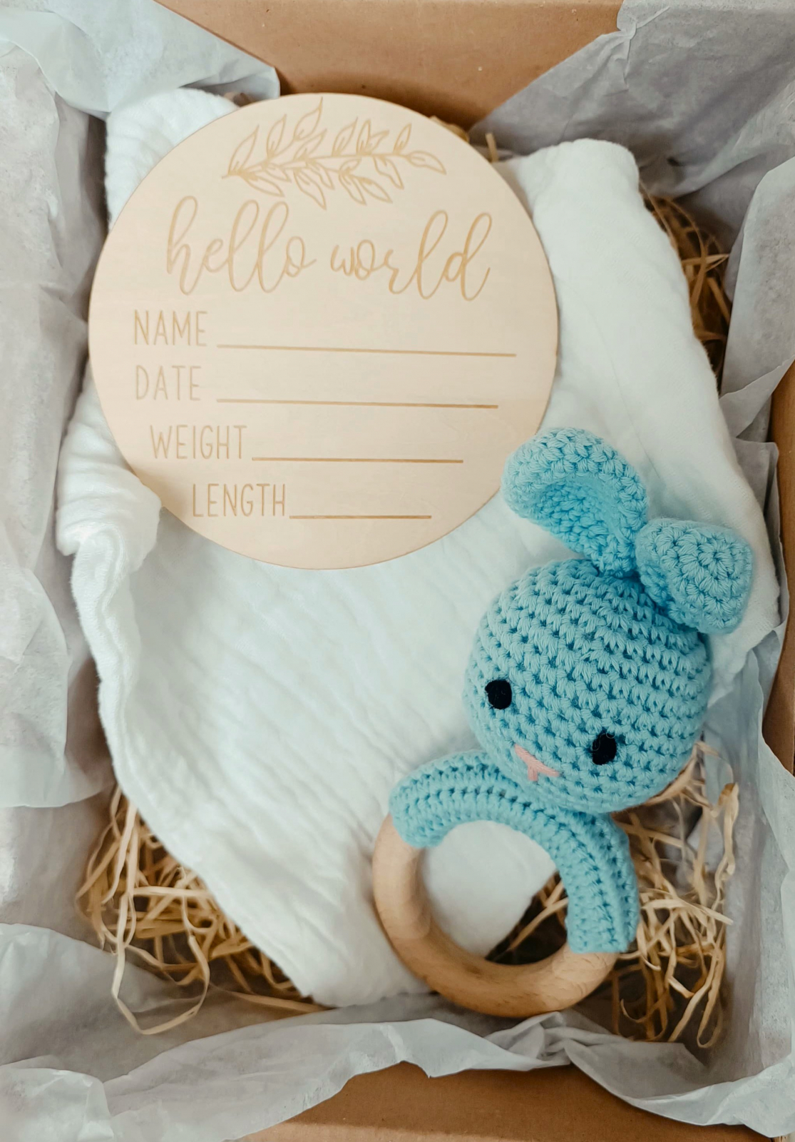 Set cadou - Jucarie dentitie iepure albastru crosetat - babetica alb