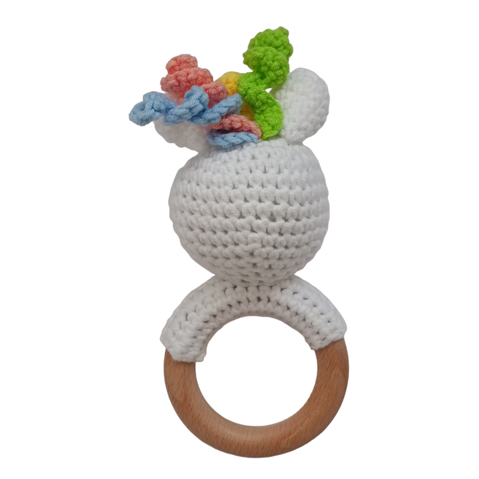 Este atasat de un inel organic din lemn natural neted, fara substante chimice, conceput pentru a fi tinut si mestecat de bebelusi pentru a-si calma gingiile in timpul eruptiei dentare.