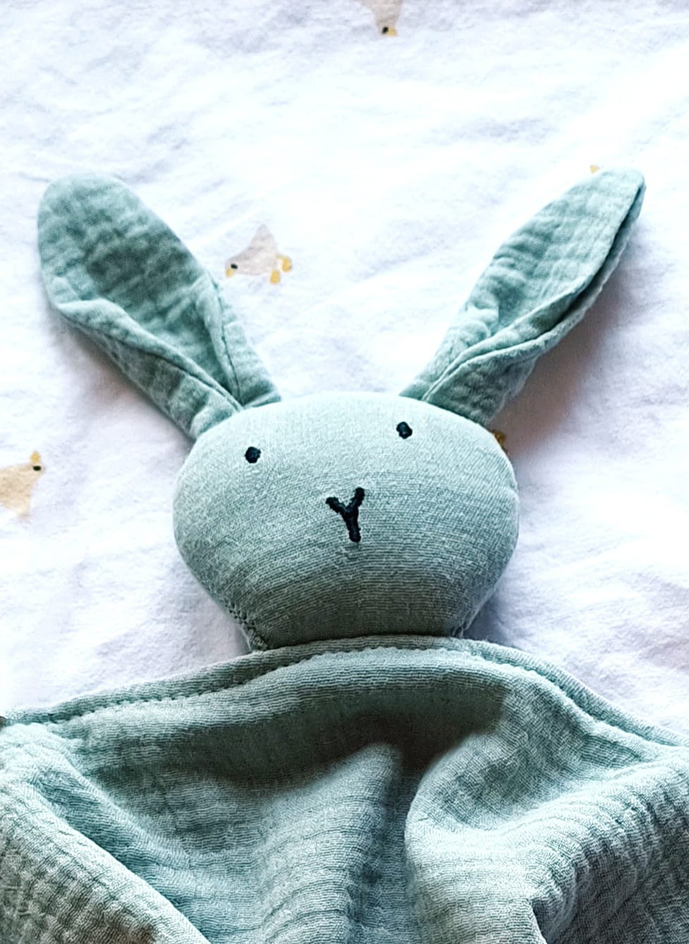 Ofera-i micutului tau confort si siguranta cu aceasta jucarie dou-dou in forma de iepuras. Fabricata din bumbac 100% de inalta calitate, materialul este placut la atingere si potrivit pentru pielea sensibila a bebelusilor. Designul minimalist si nuanta de verde confera un aspect modern si natural.