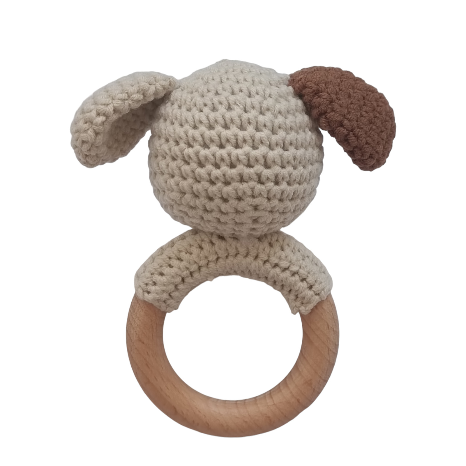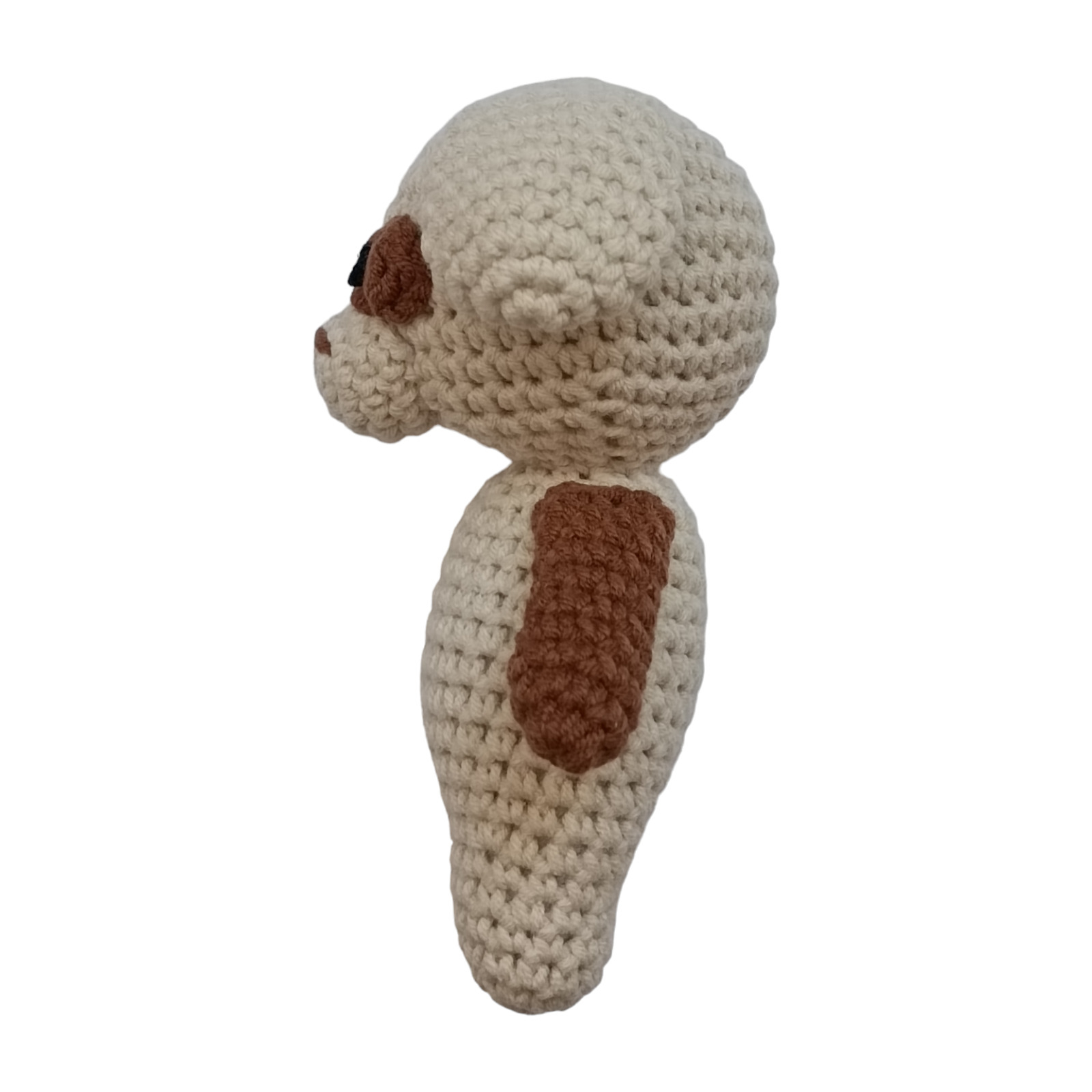 Aceasta jucarie de dentitie crosetata in forma de Catel este perfecta pentru bebelusi. Catelul are urechile lasate, ochi negrii si nasul maro.