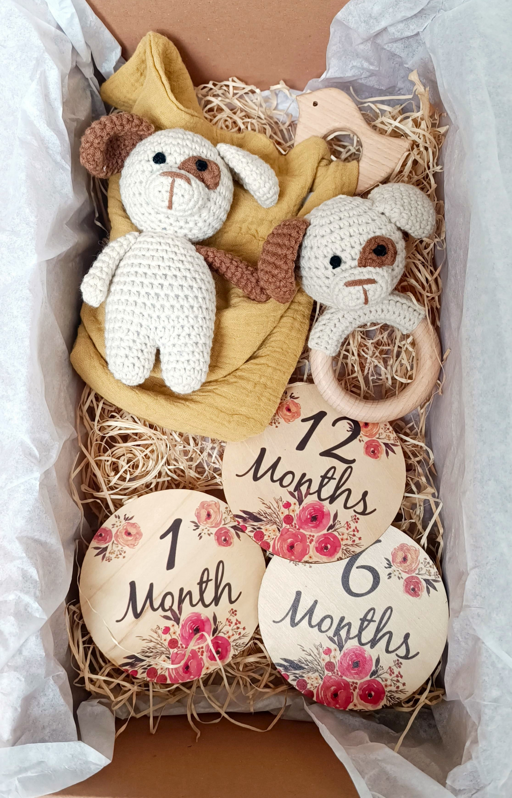 Setul cadou pentru bebelusi contine articole esentiale pentru confortul micutului tau. Acesta include o jucarie crosetata Catel, o jucarie dentitie crosetata Catel moale si prietenoasa cu pielea sensibila a bebelusului, perfecta pentru joaca si confort. Catelul are un design adorabil care va incanta orice micut. De asemenea, setul mai include o muselina mustar si carduri din lemn pentru aniversarea lunara a bebelusului.
