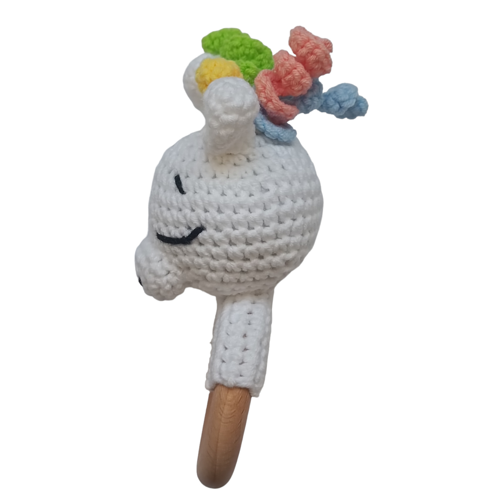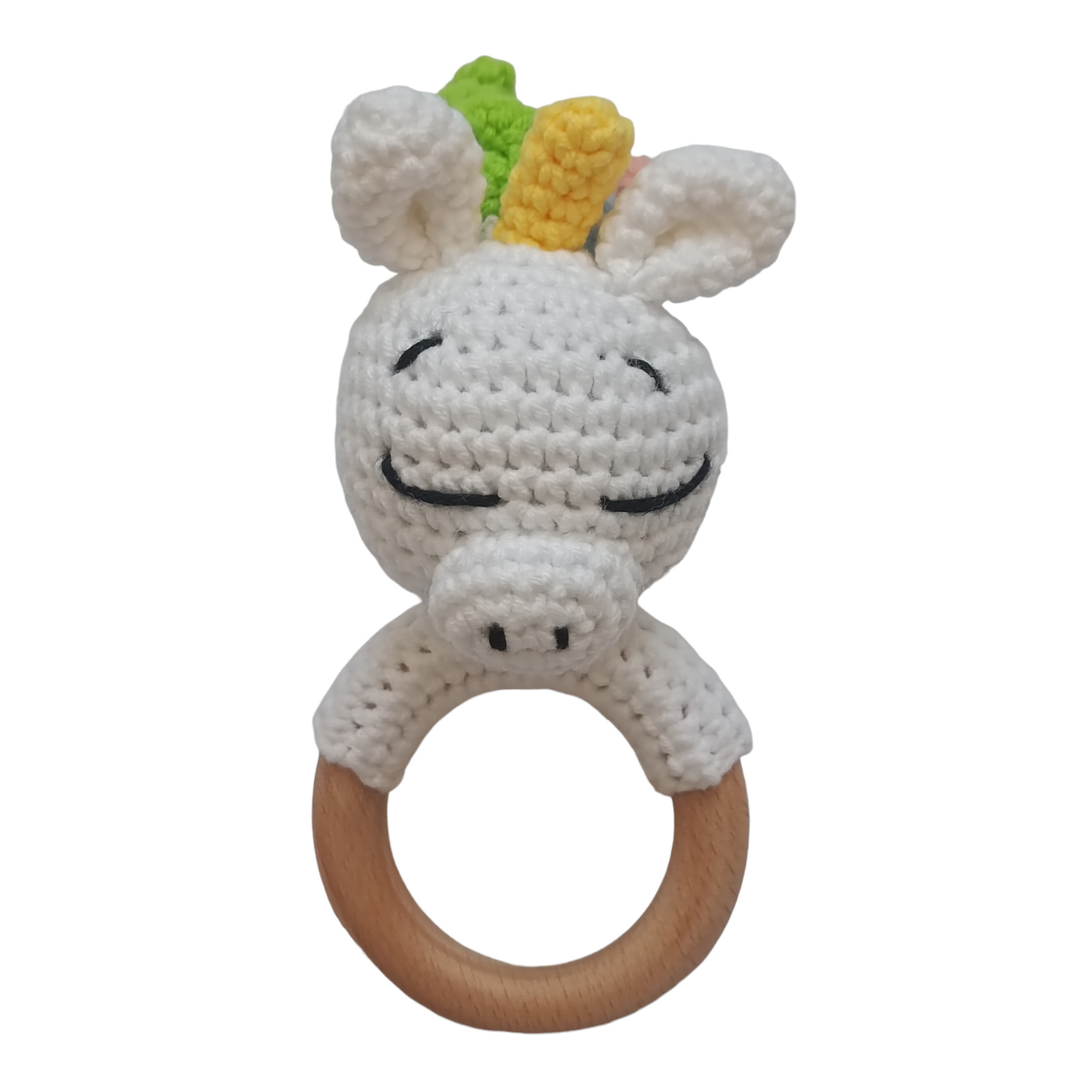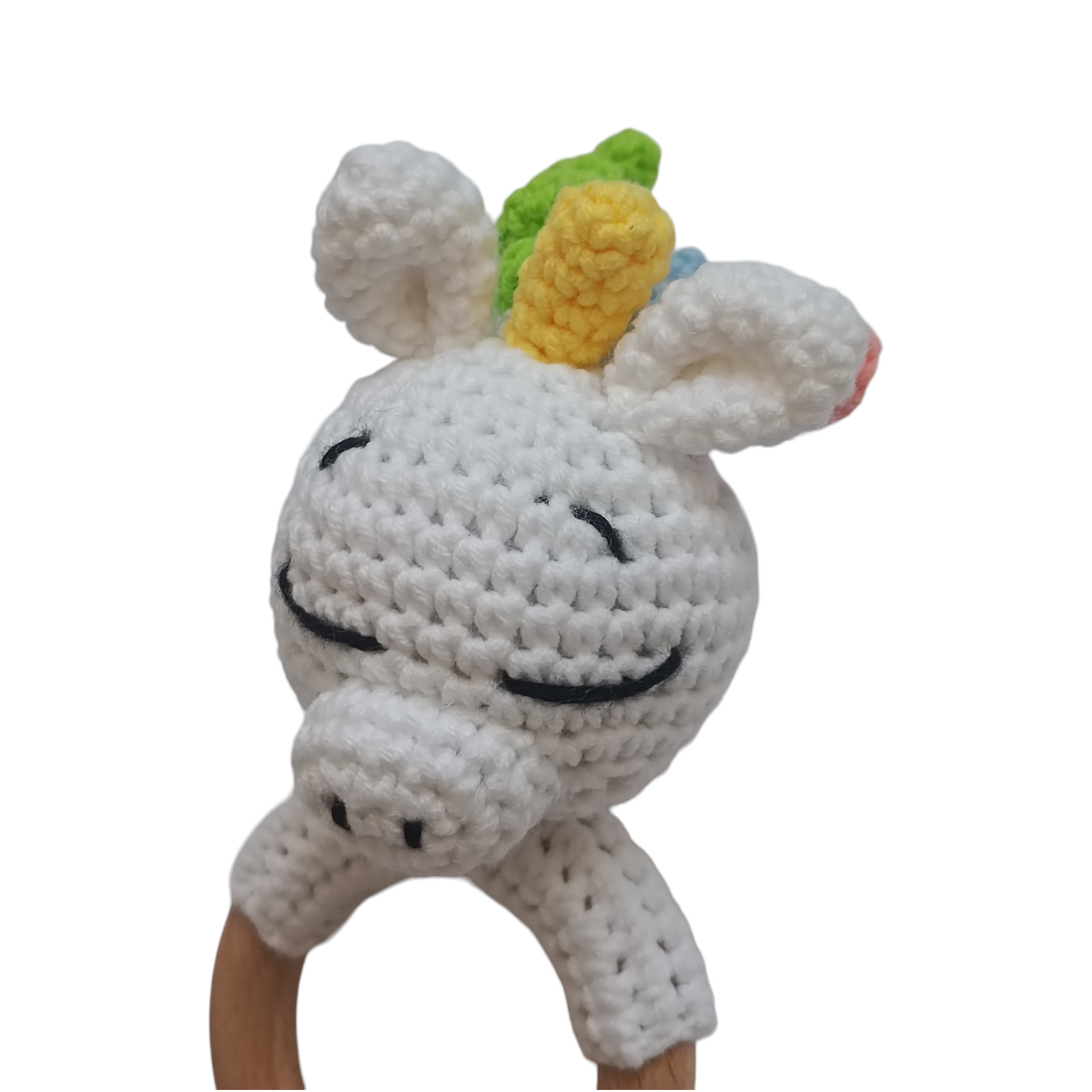 Aceasta jucarie de dentitie crosetata in forma de Unicorn este perfecta pentru bebelusi. Unicornul are ochi si nasul brodati cu fir negru, iar deasupra parul multicolor.