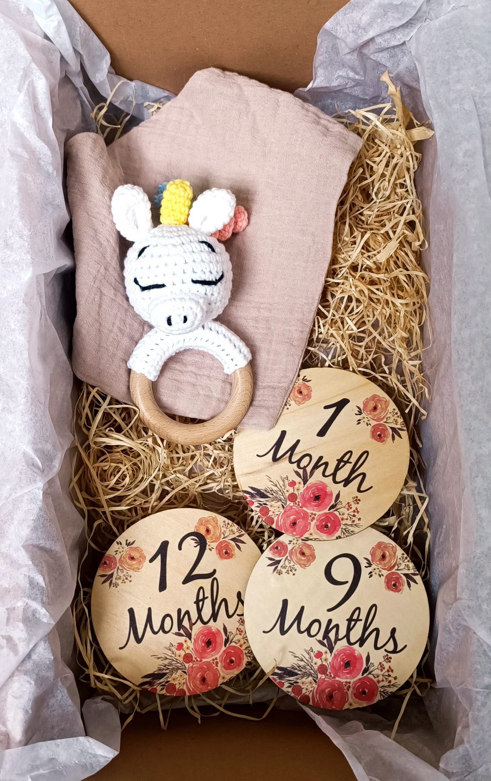 Setul cadou pentru bebelusi contine articole esentiale pentru confortul micutului tau. Acesta include o jucarie dentitie crosetata Unicorn moale si prietenoasa cu pielea sensibila a bebelusului, perfecta pentru joaca si confort. Unicornul are un design adorabil care va incanta orice micut. De asemenea, setul mai include o babetica si carduri din lemn pentru aniversarea lunara a bebelusului.