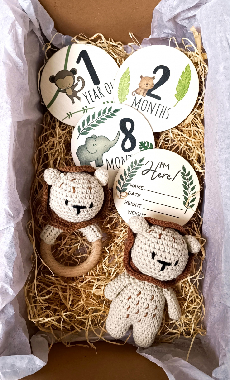 Setul cadou pentru bebelusi contine articole esentiale pentru confortul micutului tau. Acesta include o jucarie crosetata leu, o jucarie dentitie crosetata leu moale si prietenoasa cu pielea sensibila a bebelusului, perfecta pentru joaca si confort. Leul are un design adorabil care va incanta orice micut. De asemenea, setul mai include 7 carduri din lemn pentru aniversarea lunara a bebelusului.