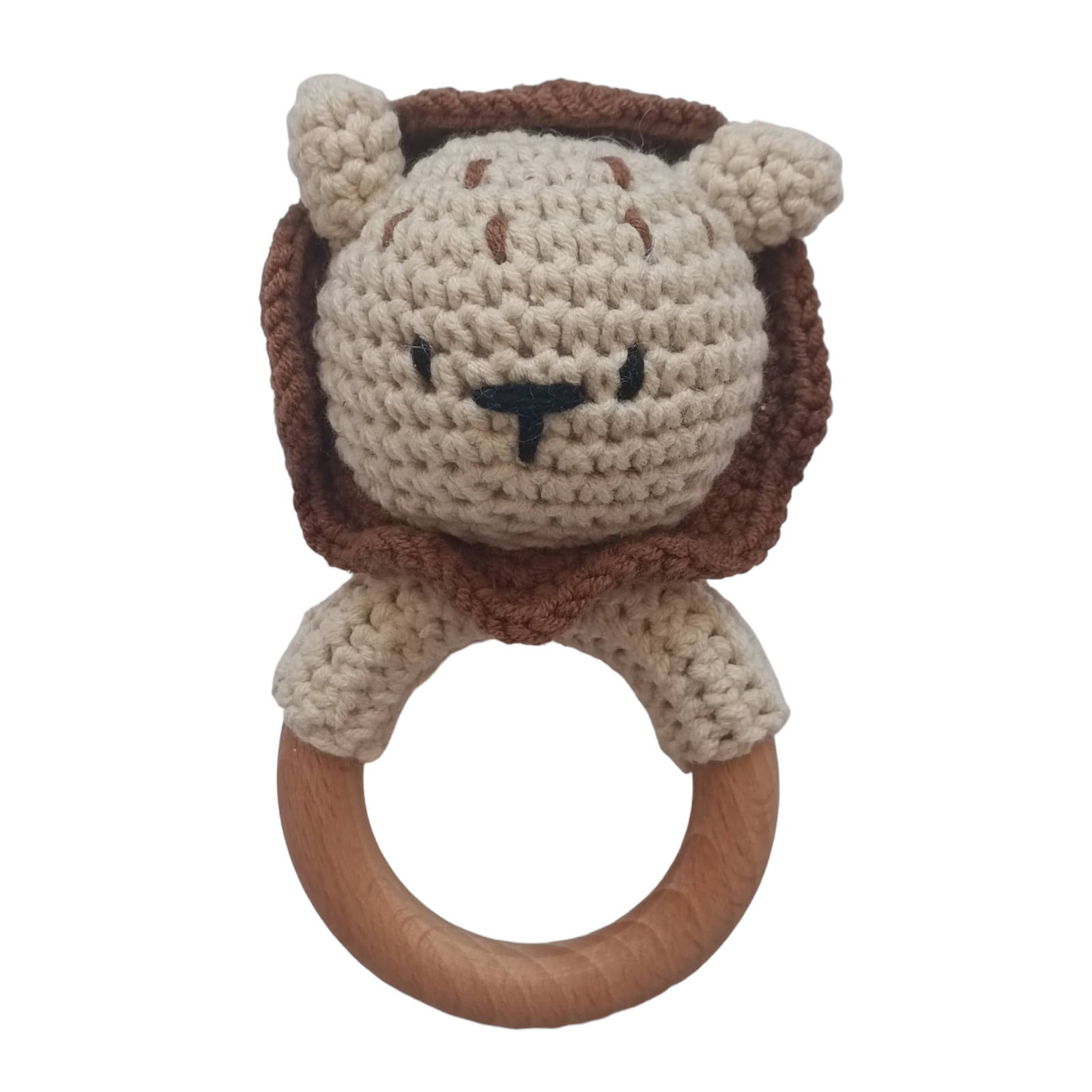 Aceasta jucarie de dentitie crosetata in forma de Leu este perfecta pentru bebelusi. Leul are urechile mici, ochi si nasul negrii. Este atasat de un inel organic din lemn natural neted, fara substante chimice, conceput pentru a fi tinut si mestecat de bebelusi pentru a-si calma gingiile in timpul eruptiei dentare.